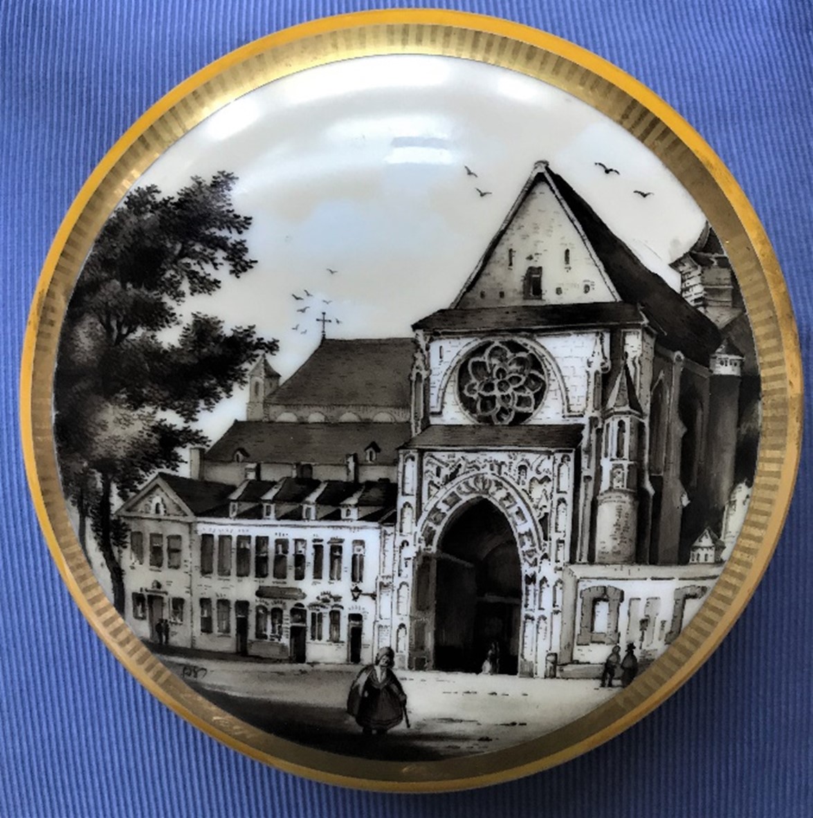This bonbonnière was produced by the famous Belgian porcelain manufacturer Demeuldre-Coché, which had a major influence on Brussels for almost two centuries. The famous decorator and landscape artist Fernand de Valeriola was commissioned to produce this view, taking over from his father Emile. He worked there from 1922 to 1936. He produced many views of Belgium and usually signed his work f.d.v. .