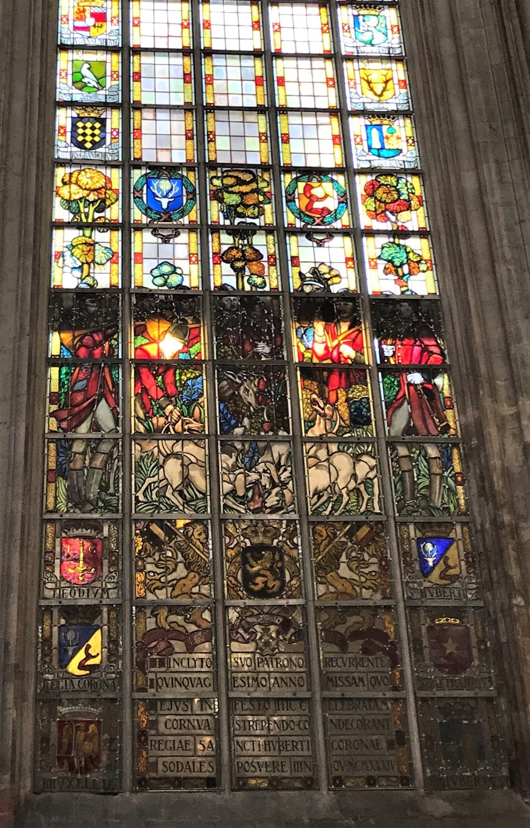 The ancient brotherhood was founded in the church of Our Lady of Victories at the Sablon in 1623 by Pope Urban VIII, under the protection of Archduchess Isabella, governess of the Netherlands and daughter of King Philip II of Spain. Many eminent families joined the brotherhood. . The brotherhood installed a large stained-glass window in the choir depicting a hunt with the coats of arms of its members around it.