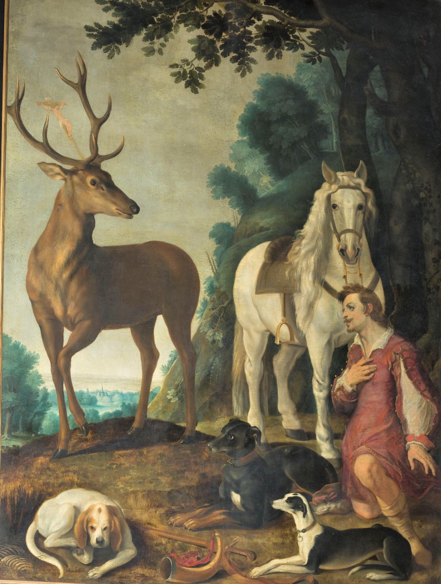 In the transept, as you leave the chapel, you will find a beautiful 17th century painting depicting the conversion of Saint Hubert by Jacob Van Oost.